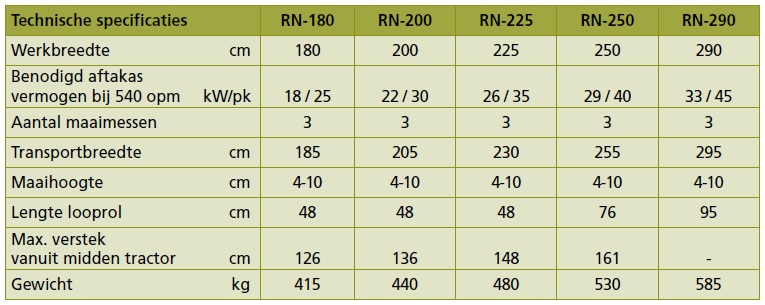 Fruitteelt strokenmaaier met 2 tandwielkasten – Serie RN - Strokenmaaier met tegengesteld draaiende messen, Door de twee achter elkaar geplaatste tandwielkasten draaien de hoofdmessen van de RN in tegengestelde richting. Dit resulteert in een nog betere afvoer en een nog betere verspreiding van het maaisel. Aankoppeling Cat. I + II Aandrijving 540 opm met een Walterscheid aftakas, Extra lage en gestroomlijnde bouwwijze met afgeronde zijkanten, 2 frontzwenkwielen en 1 looprol met conische einden en afdekdoppen op de lagers, Indirecte flexibele aandrijving via 2 tandwielkasten en grotendeels automatisch gespannen v-snaren, Ruim overlappende maaimessen met tegengestelde draairichting en speciaal geharde en omkeerbare meseinden. Mogelijkheid het gras aan beide zijden van de machine te verspreiden